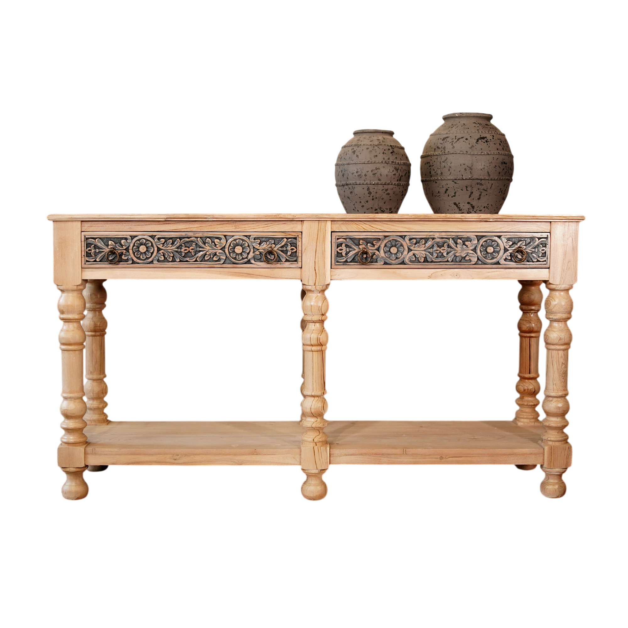 A hand-carved console table in a soft grey finish,