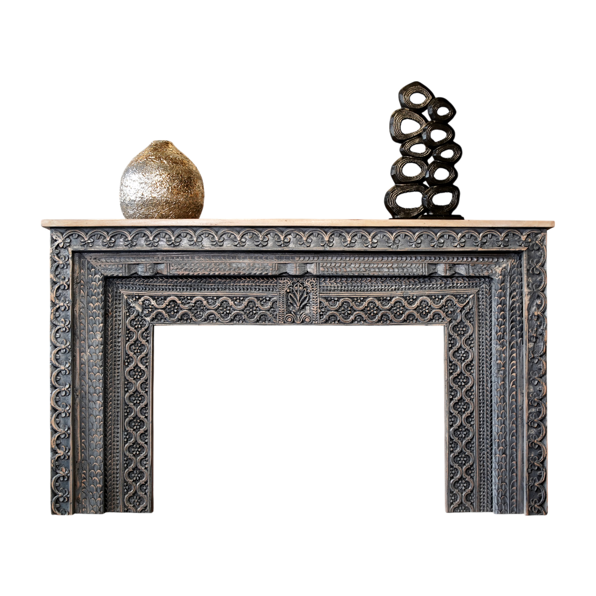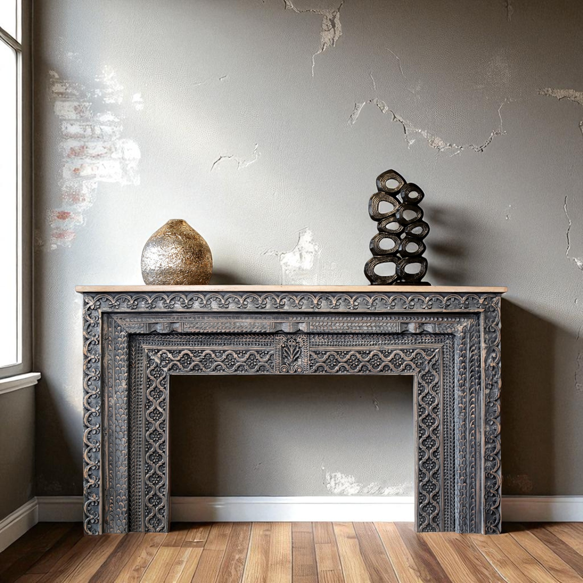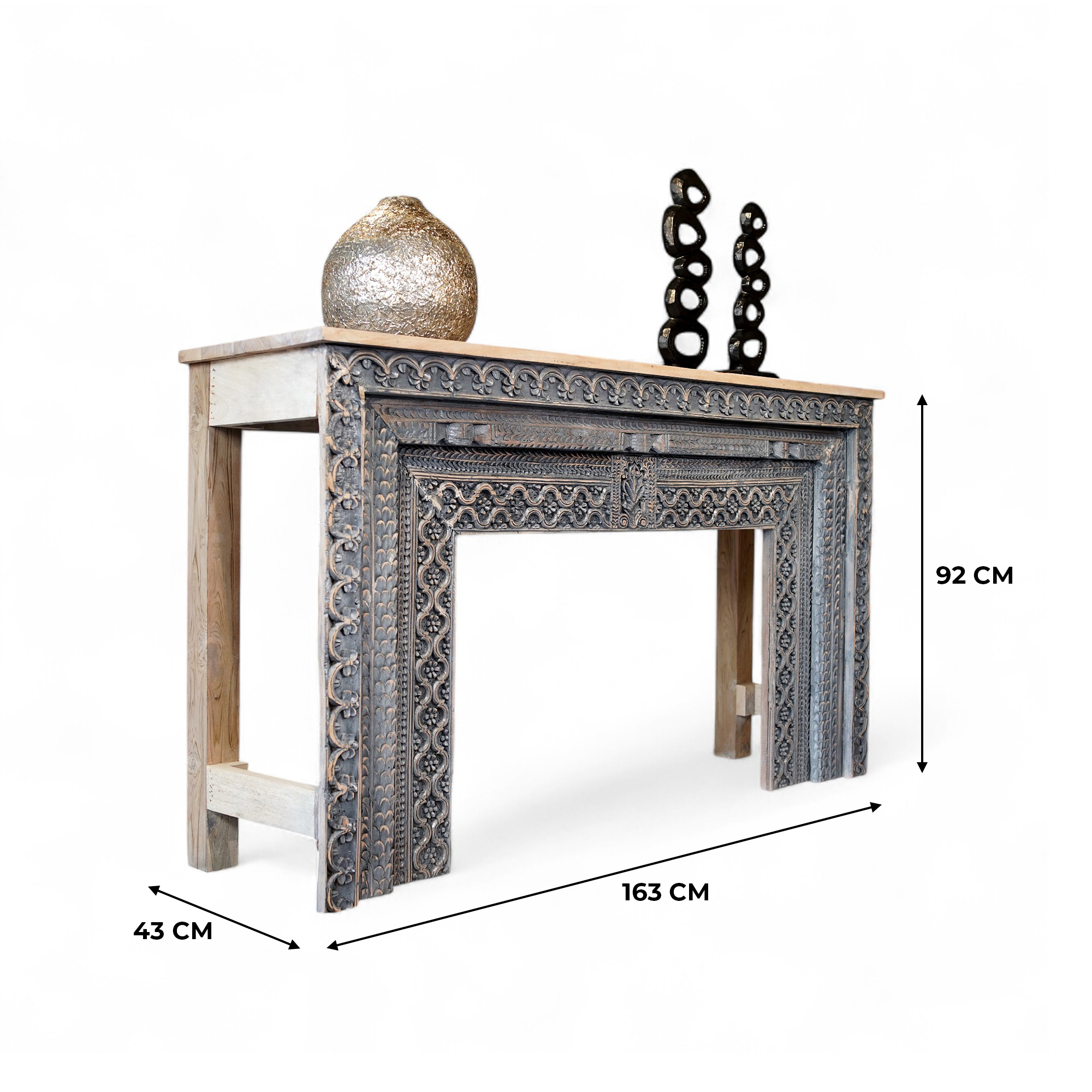 Crafted from reclaimed wood, this hand-carved console table brings character and sustainability into any space. The intricate detailing adds a touch of artisanal elegance, while the weathered texture of the reclaimed wood enhances its rustic, timeless appeal.