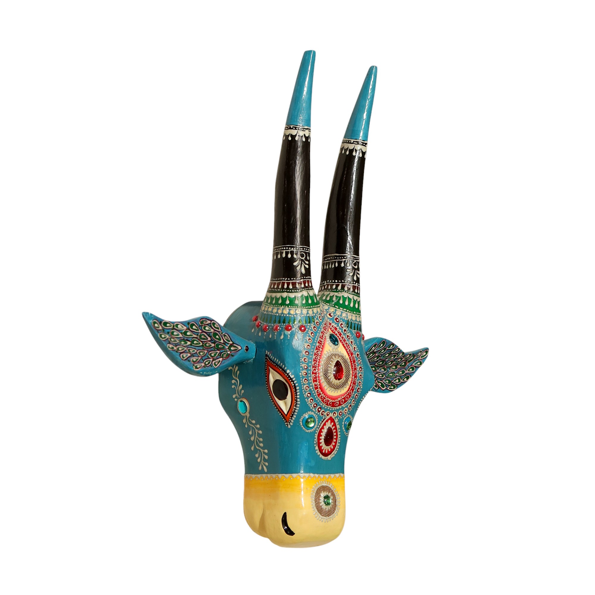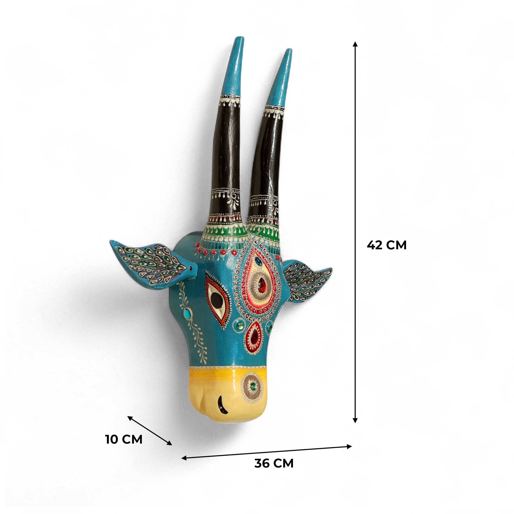This handcrafted wooden Nandi head wall decor showcases vibrant hand-painted detailing inspired by traditional Indian folk art. Featuring intricate motifs, bold colors, and elegantly carved horns, it adds a touch of cultural charm and spiritual elegance to any wall. Perfect as a statement piece for living spaces, pooja rooms, or entryways.