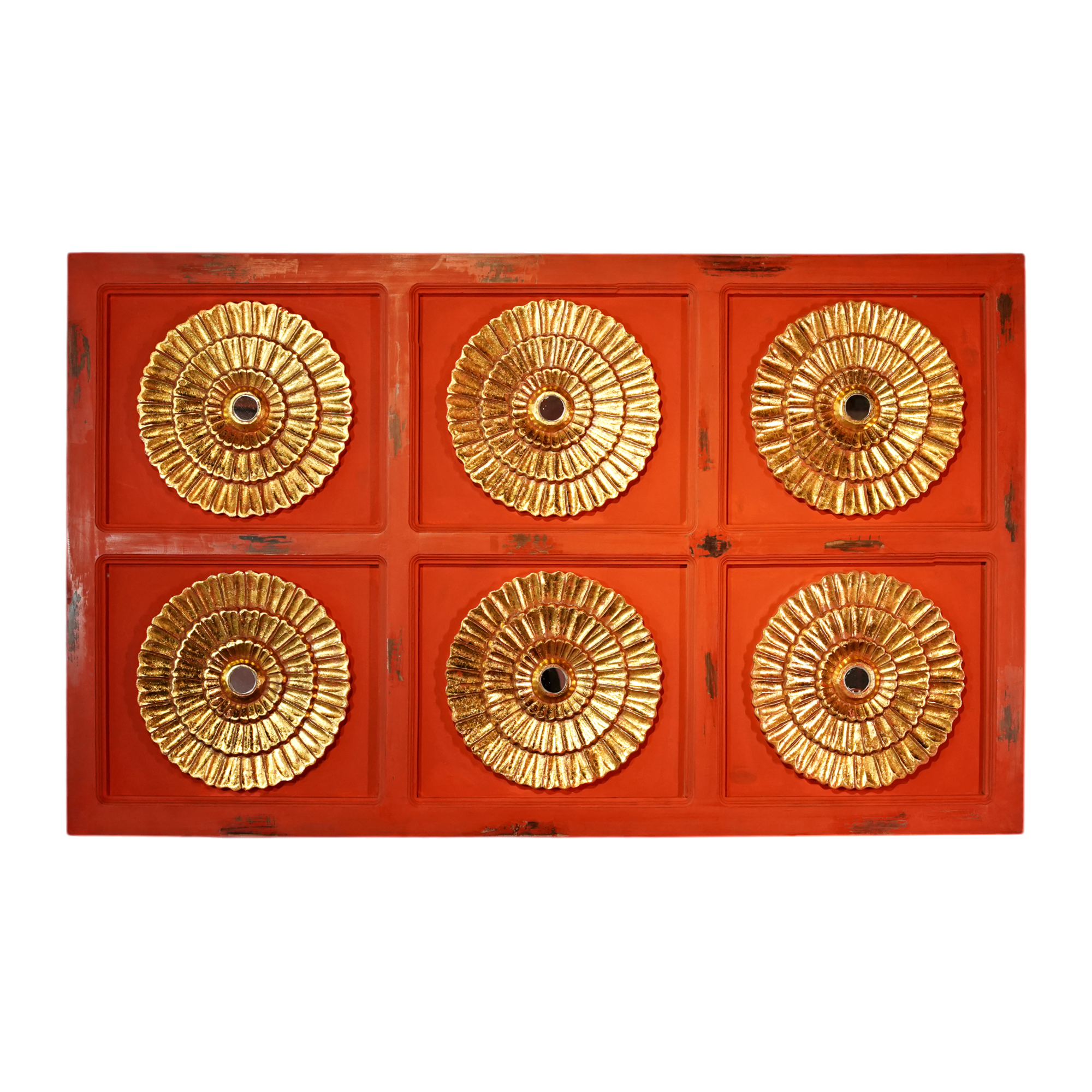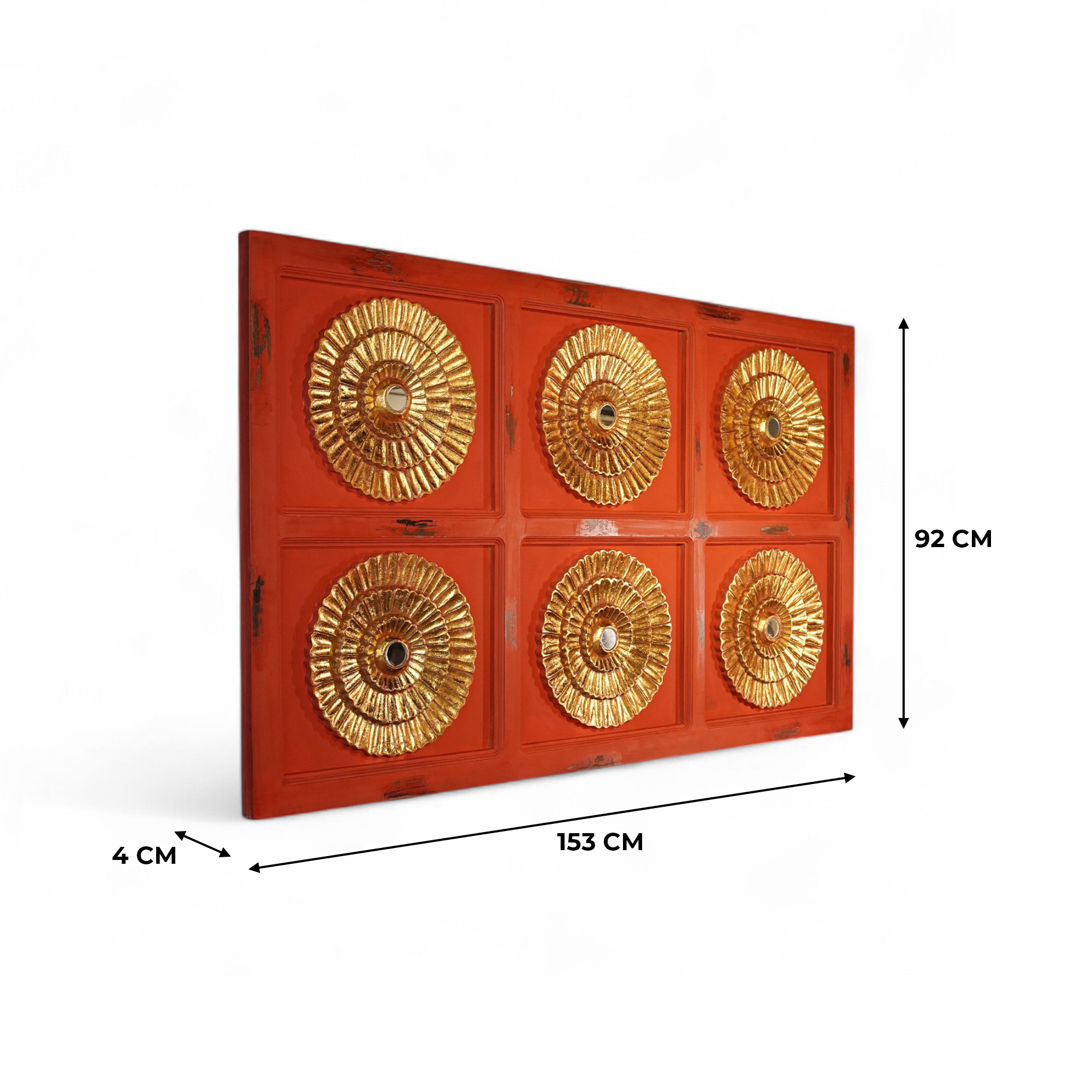 Handcrafted Wooden Wall Panel with Golden Floral Design: A contemporary interpretation showcasing elaborate golden flower patterns on a red wooden base, suitable for adding a touch of sophistication to modern interiors.