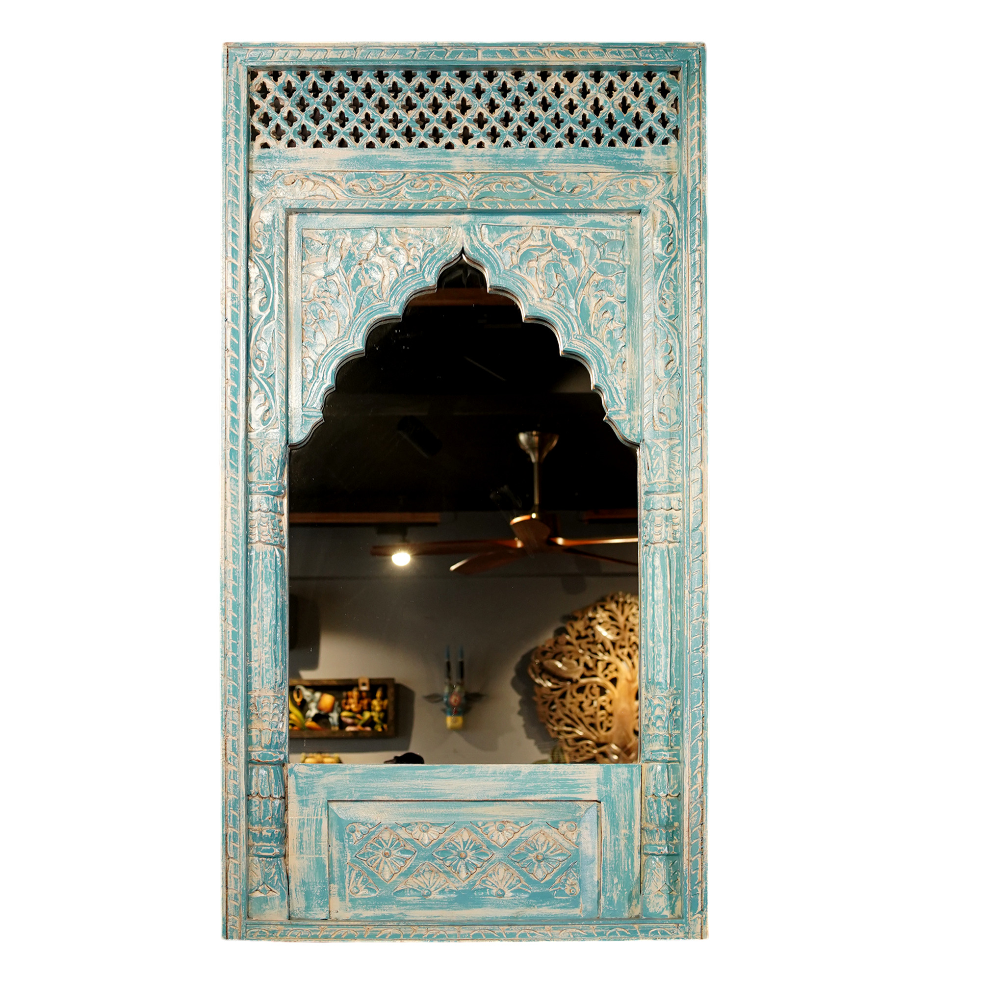 Wooden Jharokha Mirror Frame, showcasing a distressed finish that adds a vintage charm to interiors. This piece reflects traditional Indian design elements and serves as a striking focal point.