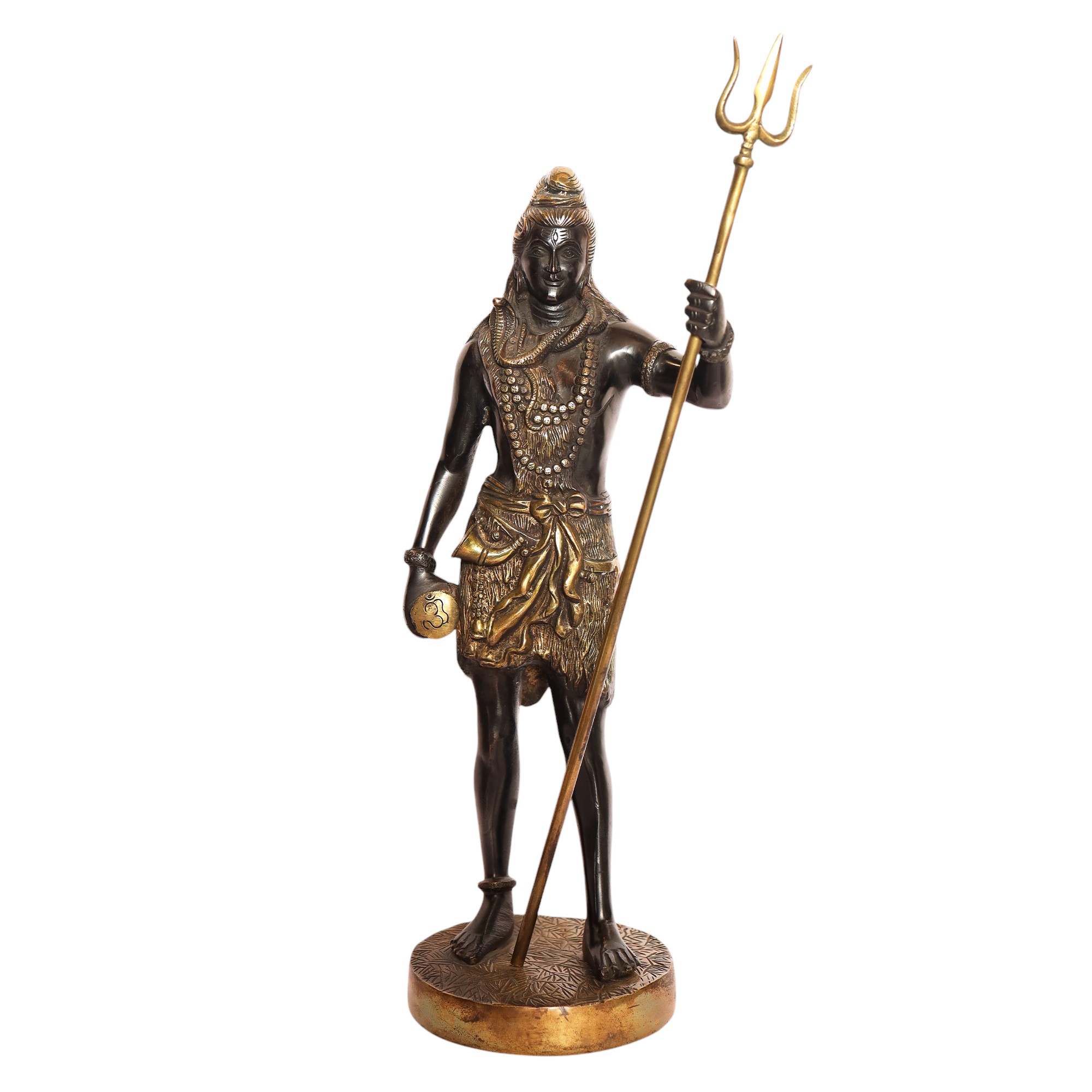 This striking brass idol features Lord Shiva standing tall with his trishul and damru, finished in elegant black and gold. A powerful symbol of transformation, protection, and cosmic energy—ideal for worship and spiritual décor.
