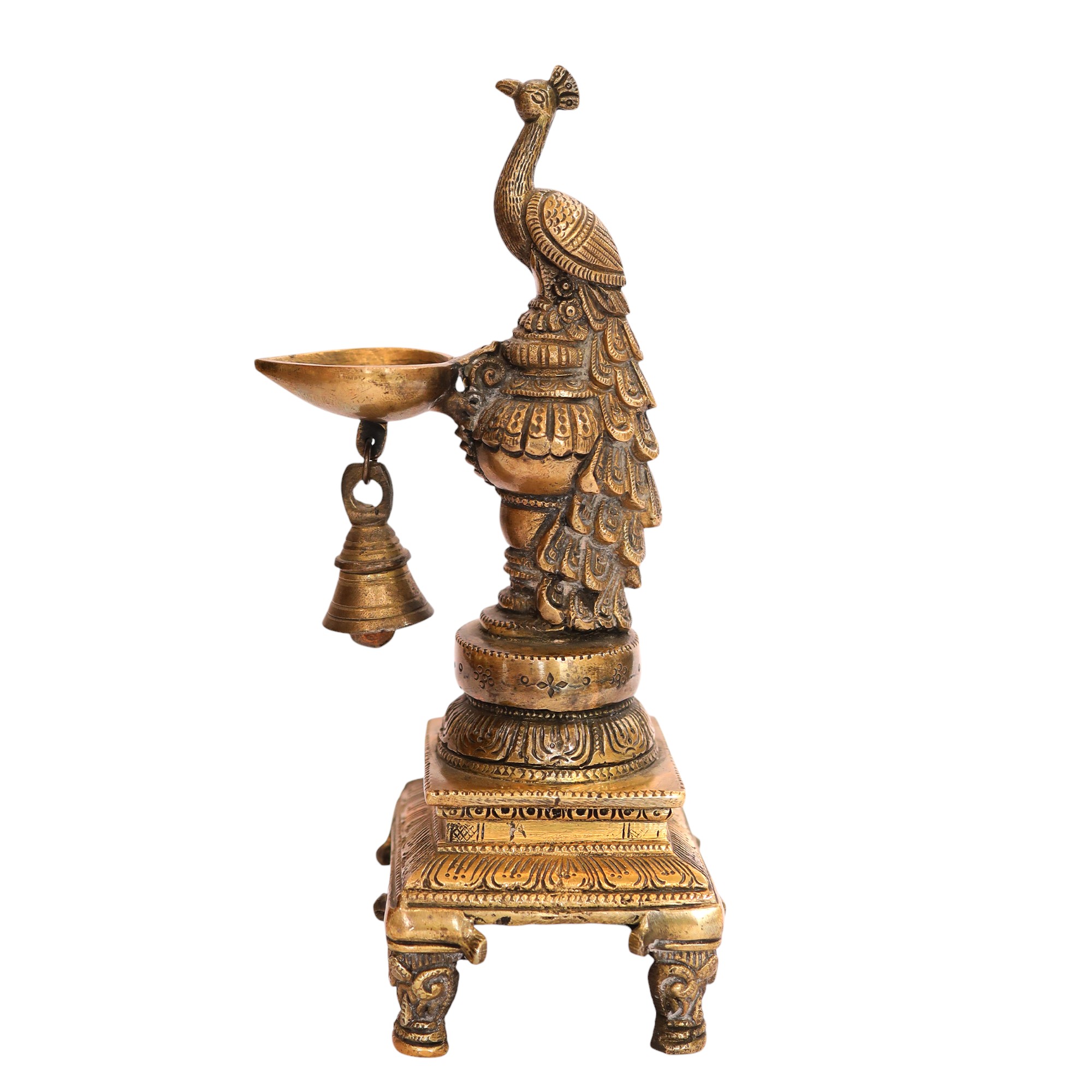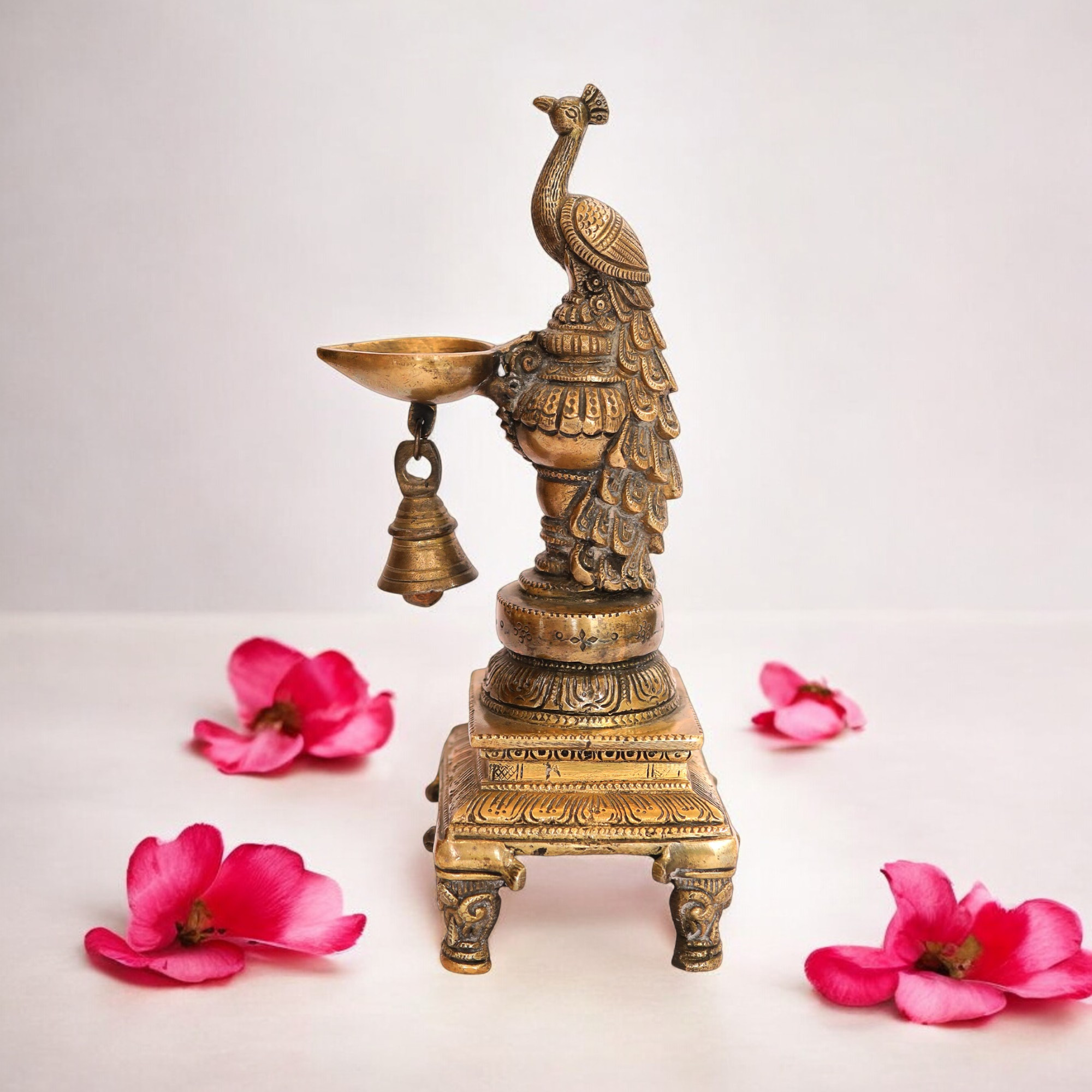 Elegant brass peacock design featuring a diya and bell – symbolizing beauty, light, and devotion in one graceful piece.