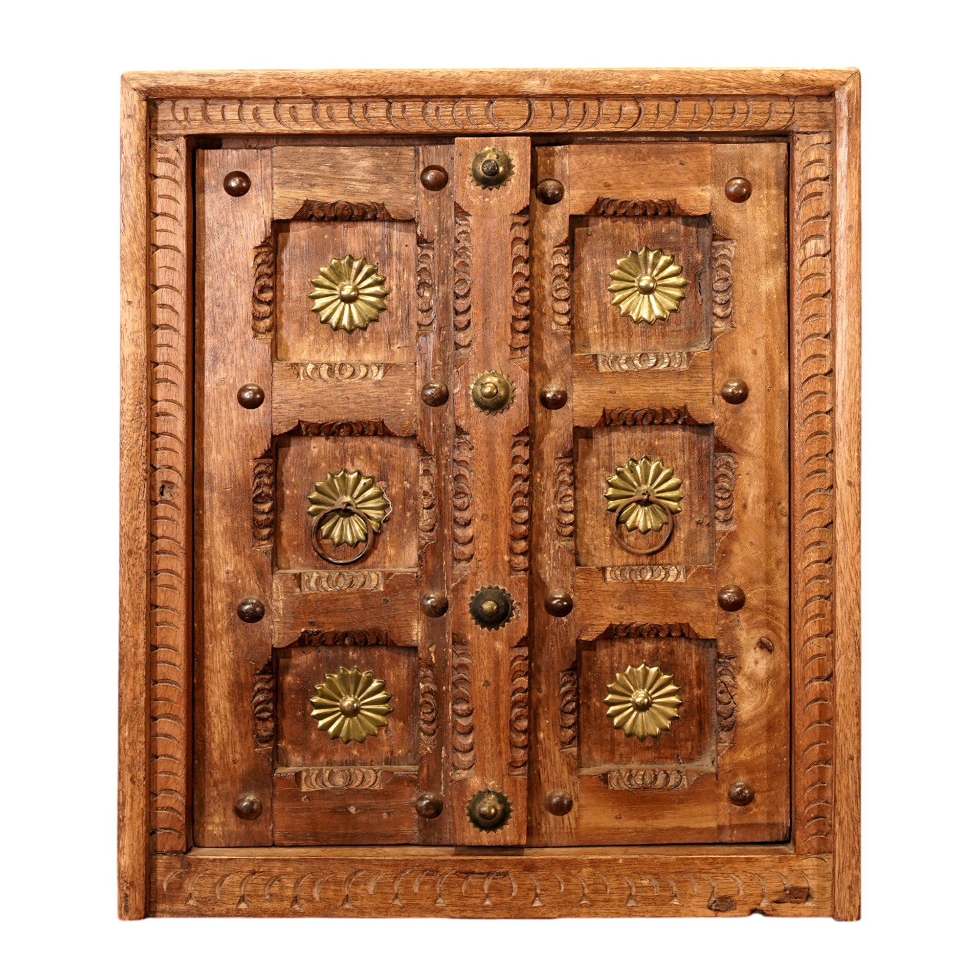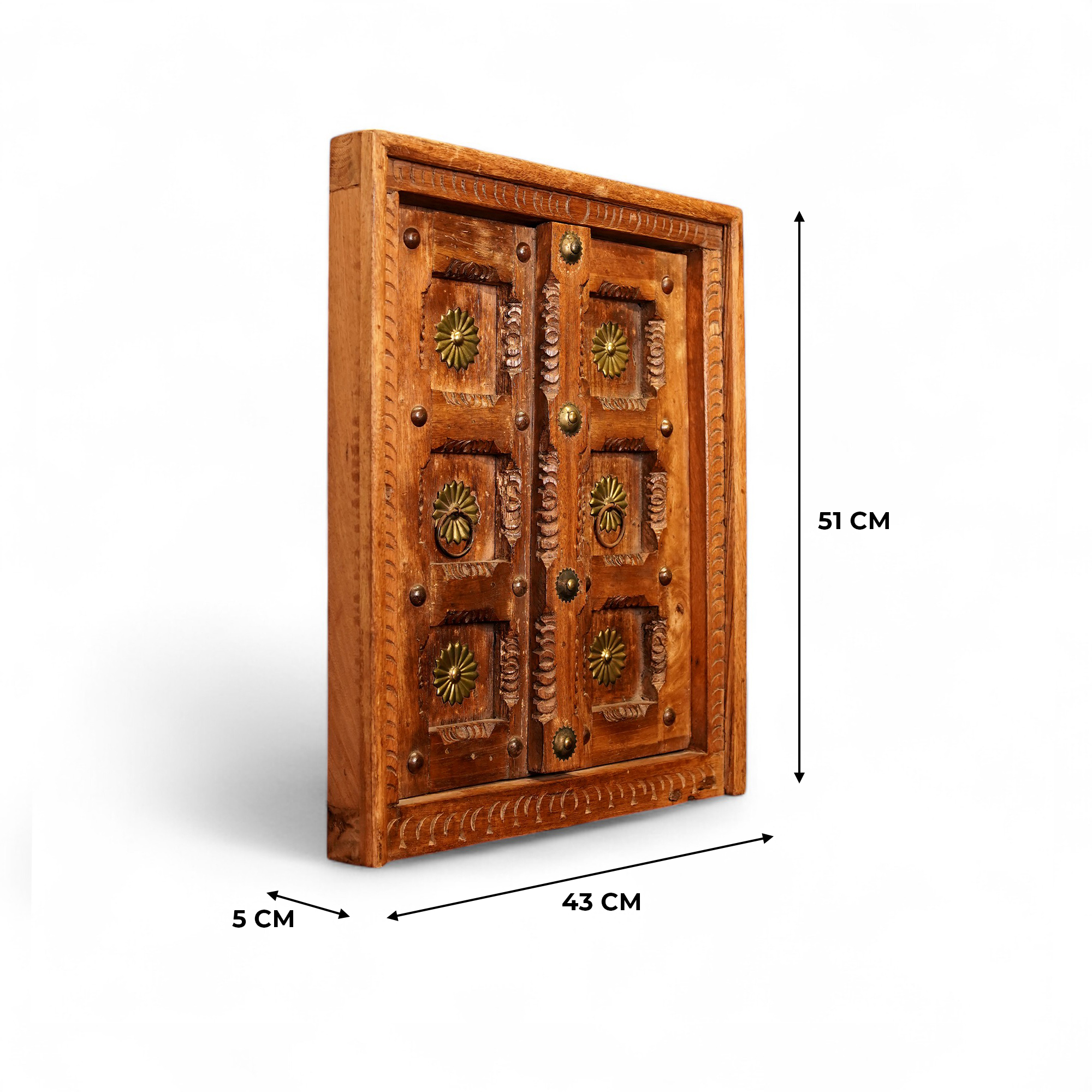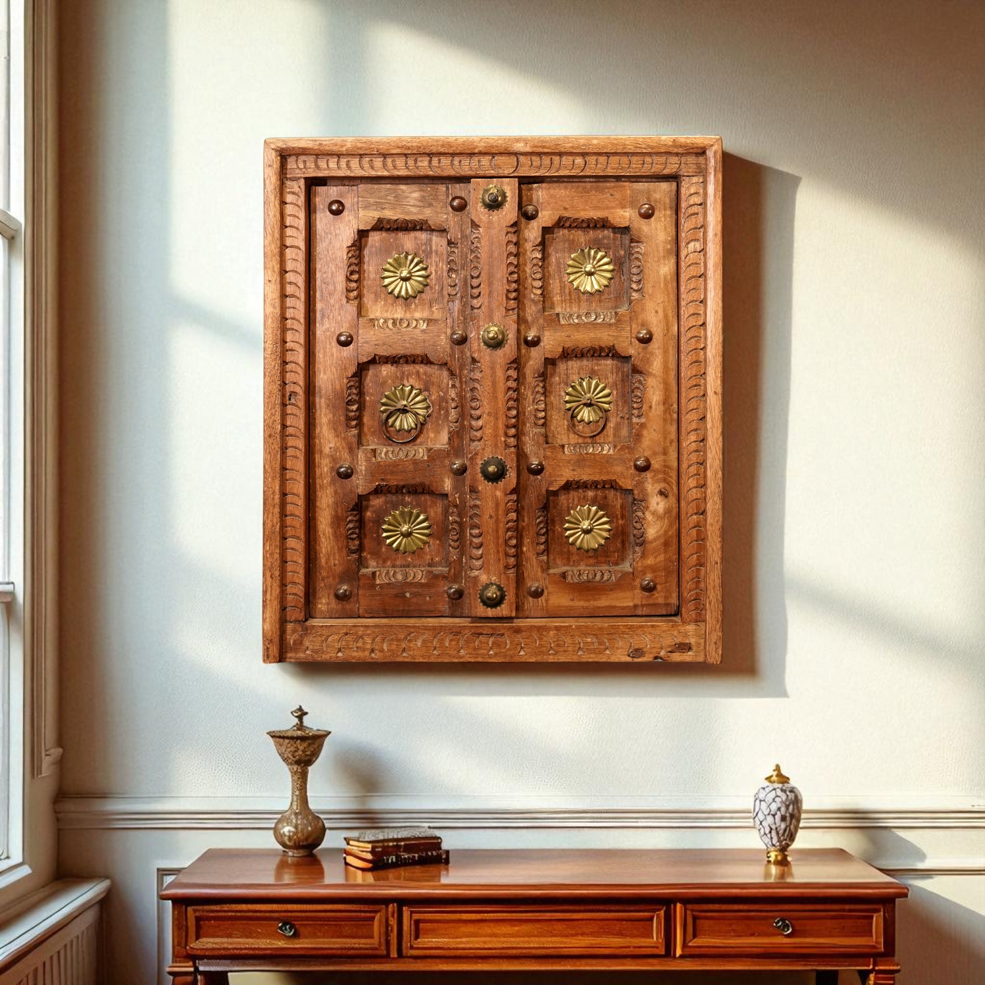 This wooden frame is embellished with intricately fitted brass floral designs, exemplifying traditional Indian craftsmanship. Serving as an elegant wall hanging, it adds a touch of heritage to any space.